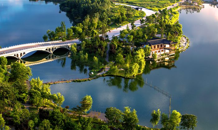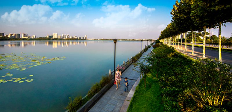 平湖歸雁景區(qū)緊鄰黃州大道,規(guī)劃面積30萬平方米。該景區(qū)視野通透,首先映入眼簾的是一灣平靜的湖水,不由得聯(lián)想起蘇東坡《西江月》中“點點樓頭細雨,重重江外平湖”的詞句。徜徉于湖邊樹下,忽見開闊的湖面上空飛來一群雁陣,感受大雁歸來的喜悅,實為人生樂事。蘇東坡《調笑令》中“歸雁,歸雁。飲啄江南南岸”的詞句,也與此情此景交融相映。該景區(qū)是市民戶外運動休閑的功能區(qū)。